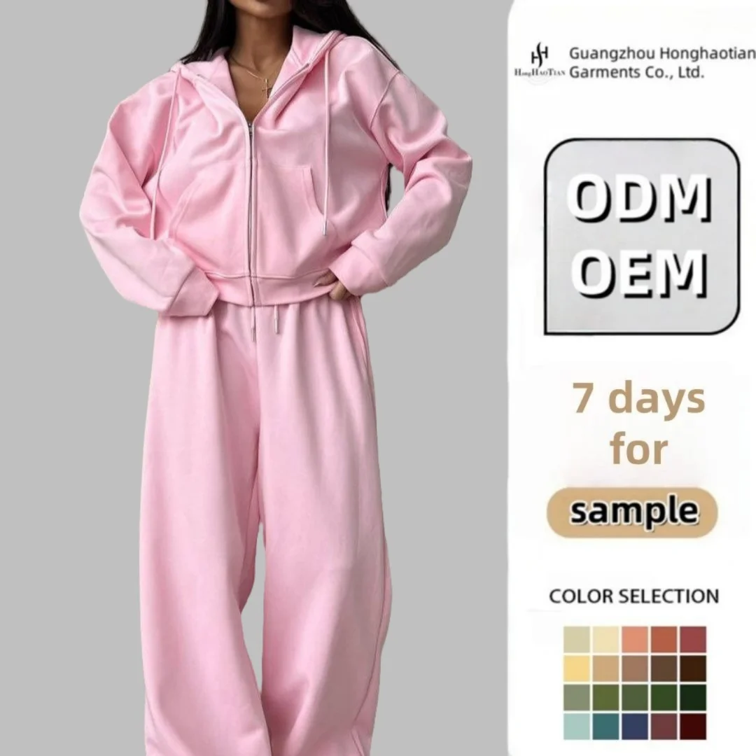 Custom Logo Casual Long Sleeve Zip Front Hoodie Drawstring Joggers Two Piece Athletic Lounge Wear Women's Matching Workout Set